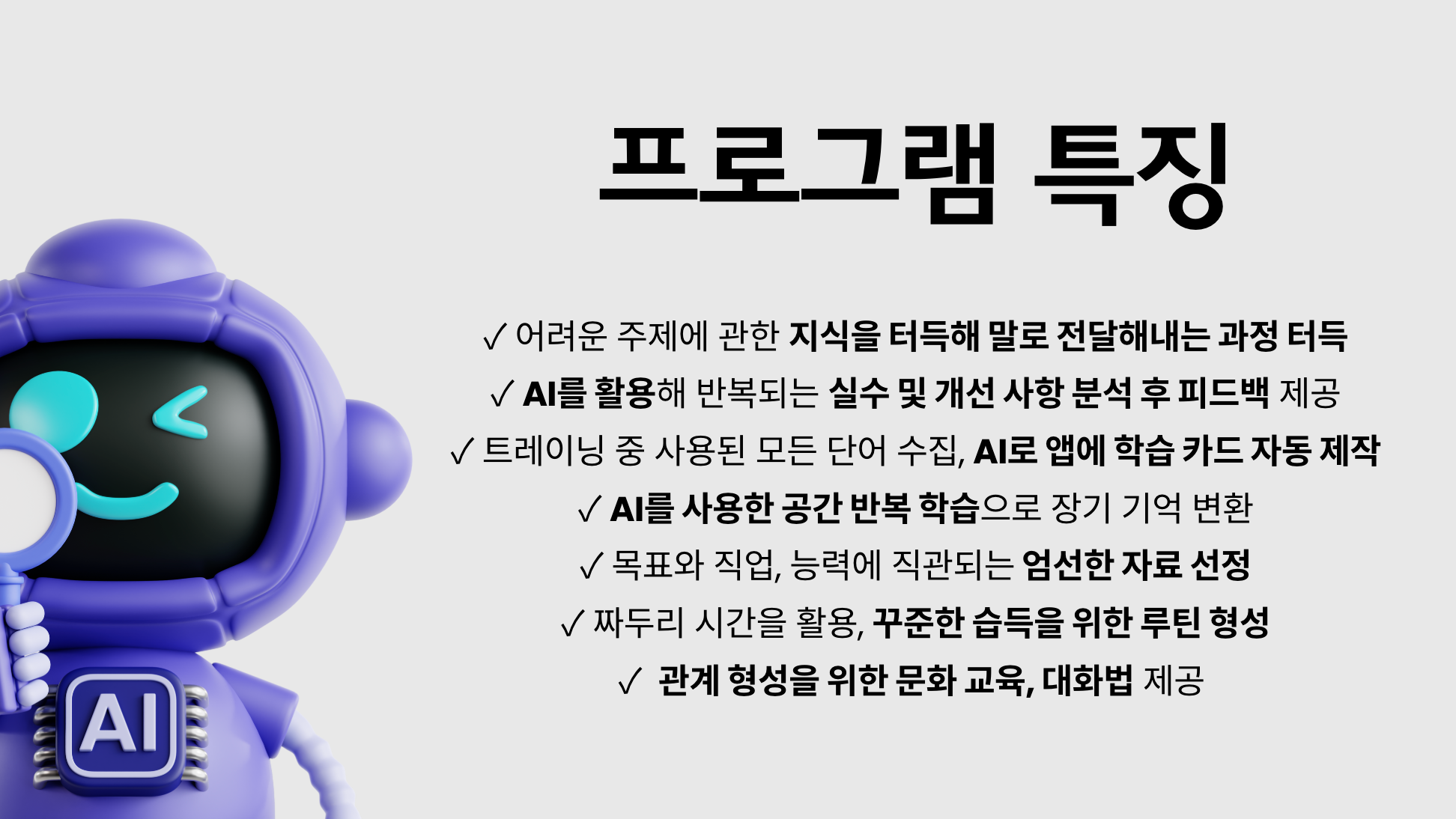 - 스피킹 트레이닝 시 AI를 활용해 반복되는 실수 및 개선 사항 분석 후 피드백과 추가 자료 제공
