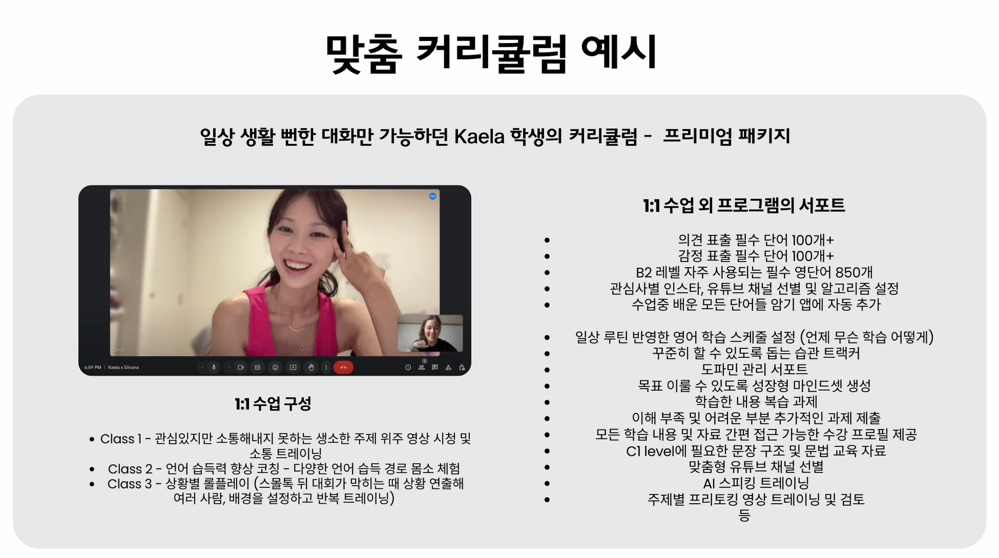 - 원어민 코칭 옵션: 자연스러운 발음과 표현 습득 가능
